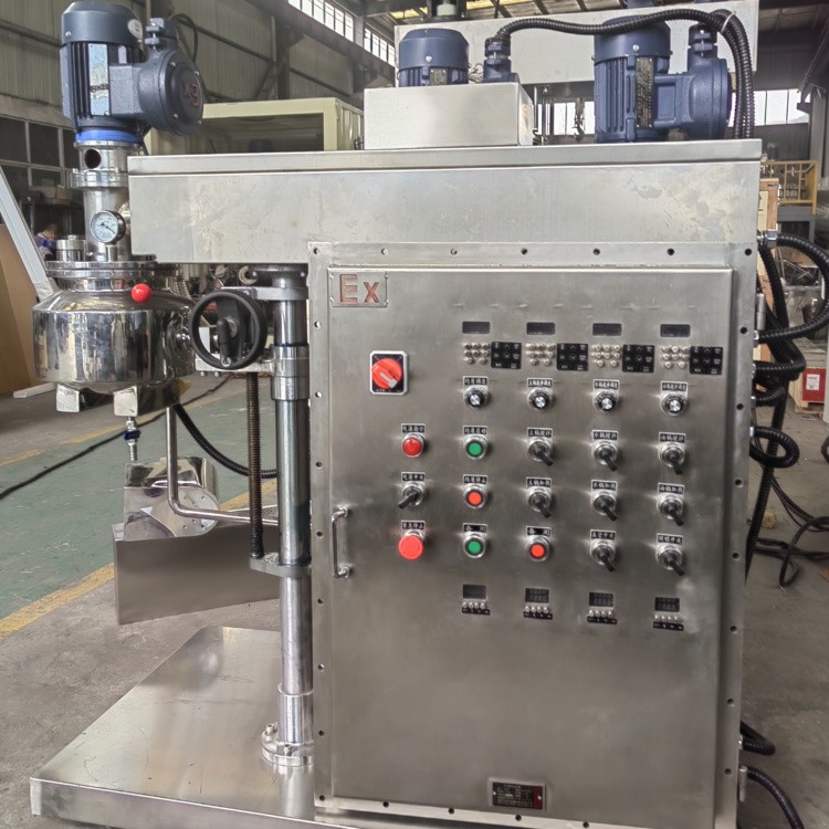 第三種是分散盤式溶解攪拌器,在均質(zhì)乳化機(jī)的攪拌軸底端裝有一圓盤狀的攪拌器--分散盤攪拌器,由電機(jī)直接帶動(dòng),轉(zhuǎn)速為1400rpm。它的旋轉(zhuǎn)方向與刮板攪拌器相反。分散盤在攪拌軸上可上下移動(dòng)調(diào)節(jié),以達(dá)到更佳的效果。這種攪拌器攪拌時(shí)相當(dāng)激烈,物料由中心向外翻騰,它的作用是迅速將新加入的組份潤(rùn)濕混合和分散溶解到液體或膏狀物料中,它是一種剪切力很大的攪拌器,適合高粘度物料。它與均質(zhì)乳化機(jī)的刮板攪拌器和膠體磨組合成另一形式的均質(zhì)攪拌系統(tǒng)。