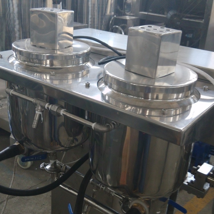 第二步,把真空均質乳化機的主鍋密閉好,抽真空。注意觀察主鍋上的負壓表,當抽到表上指針不再動時,用負壓把水鍋中的物料抽入主鍋內。