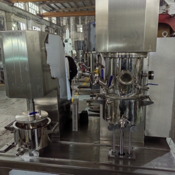 現(xiàn)階段常用的行星攪拌機通常有兩個低速檔大行星攪拌槳(通常為多斜漿葉式,大麻花式,框式),一個或2個快速大行星攪拌槳(分散化盤)和刮壁槳構(gòu)成。